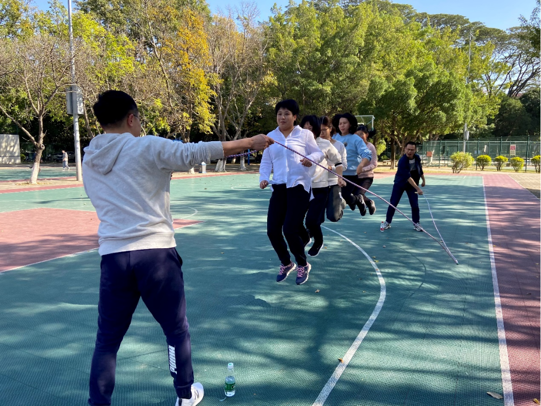 比赛分三个项目,分别是多人合作的绕“8”字接龙跳、大家一齐跳和单人跳。通过三轮的激烈比拼,我院教工团队获得团队第四名的好成绩。